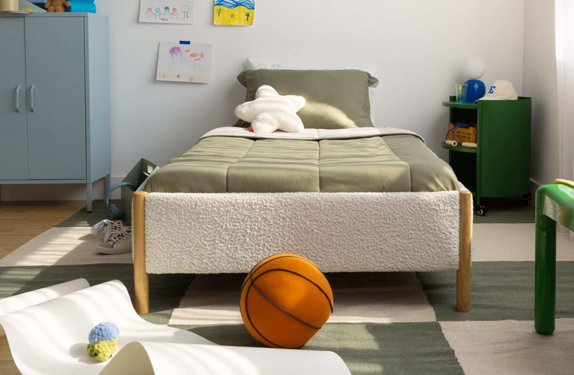 Des teintes en douceur, de riches textures et un style confortable qui plait à petis et grands. Ce lit plateforme rend toute chambre d'enfant plus chaleureuse!